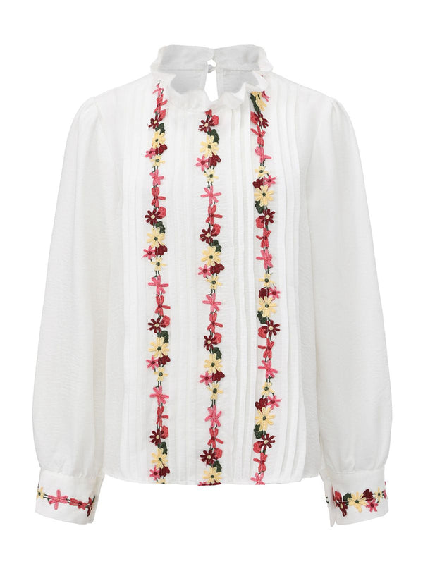Weiß 1930er Blumen Besticktes Rüschen Kragen Bluse