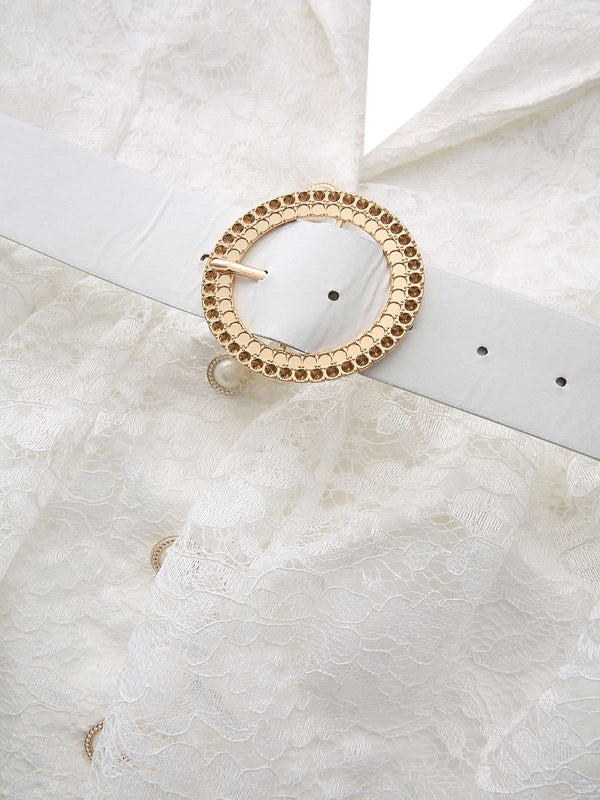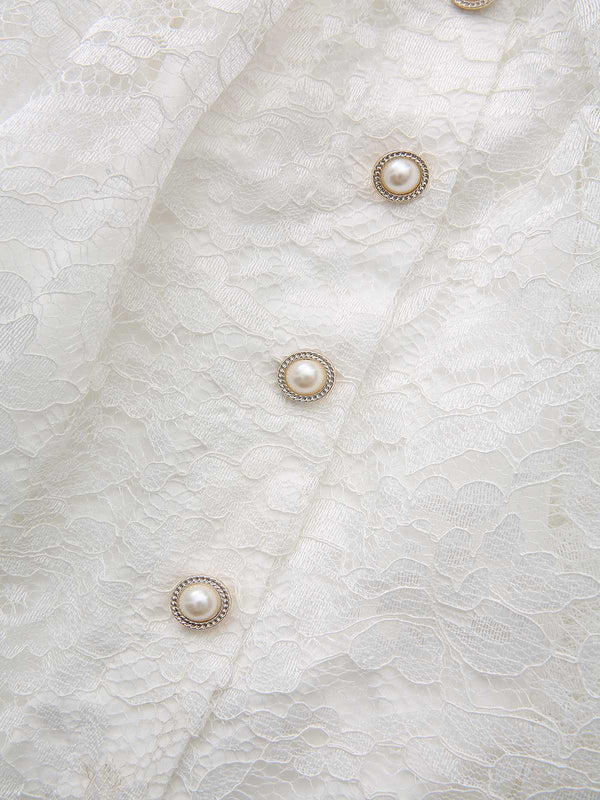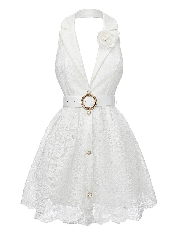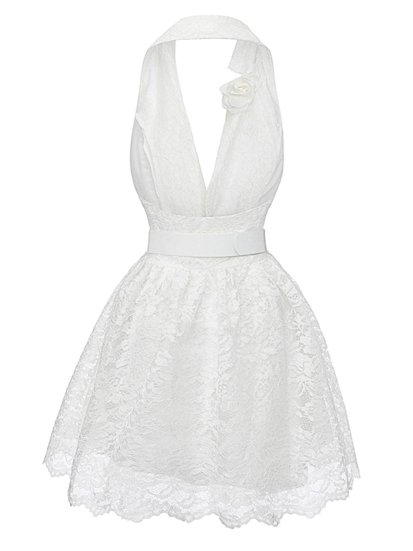 Weiß 1950er Tief V Spitze 3D Rose Halter Revers Kleid