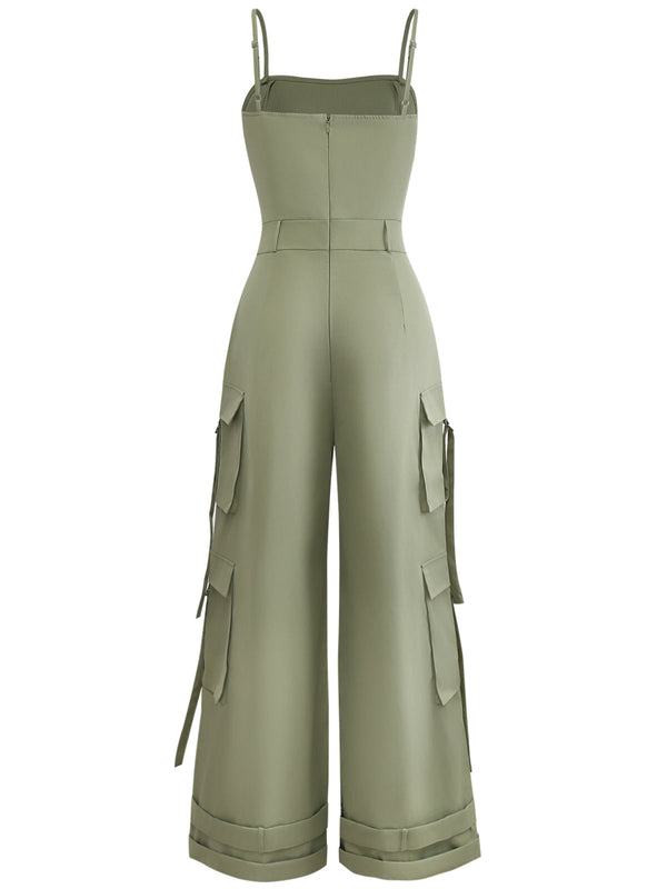 1970er Solide Spaghetti Träger Cargo Stil Weitbeinig Jumpsuit