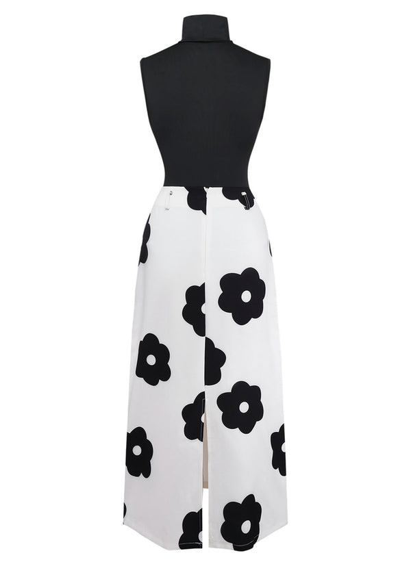2PCS Schwarz 1930er Rollkragen Top & Blumen Rock