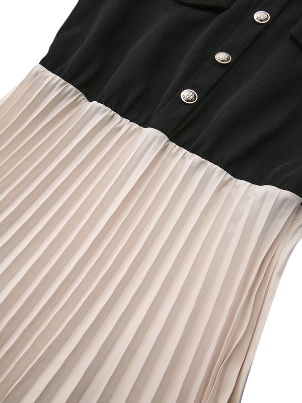 Khaki 1940er Revers Farbblock Plissiertes Swing Kleid