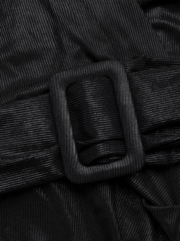 Schwarz 1960er Kunst Leder Gürtel Feder Ärmel Kleid