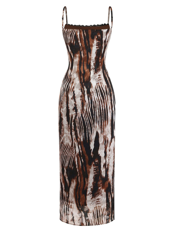 [Vorverkauf] Braun 1960er Slip Tiger Druck Spitze Seiten Schlitz Kleid