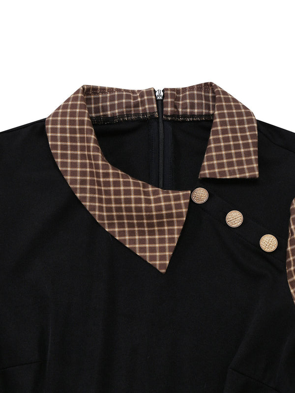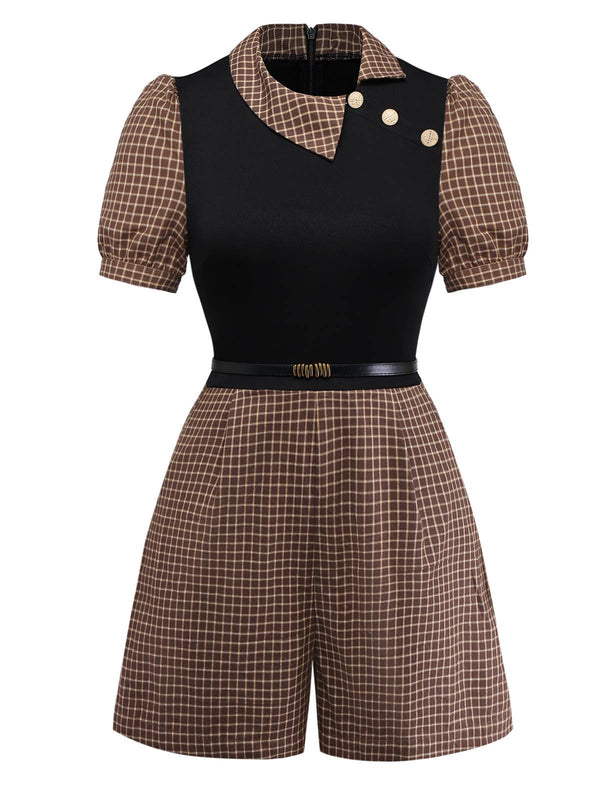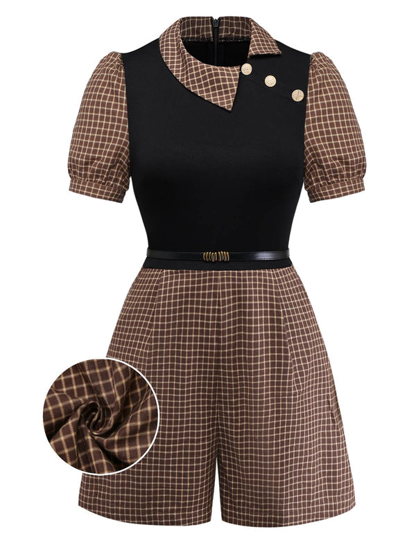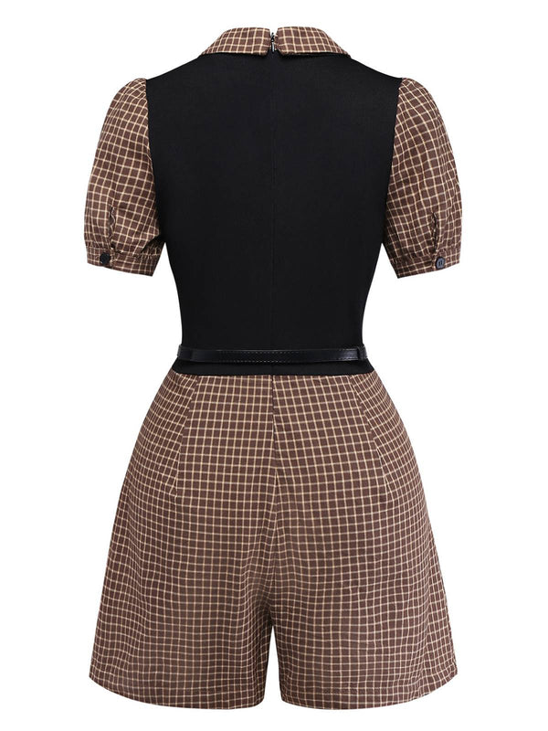 [Vorverkauf] Braun 1940er Kariert Stricken Seite Revers Gürtel Romper