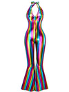 Mehrfarbig 1970er Regenbogen Farbblock Disko Halter Jumpsuit