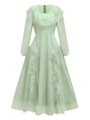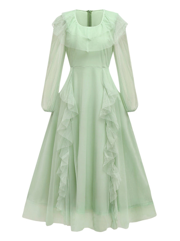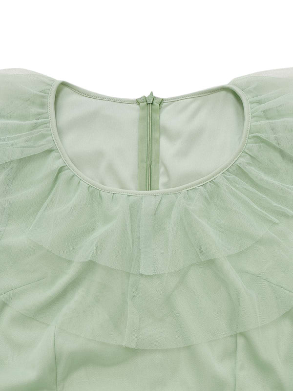 Grün 1930er Solide Netz Rüschen Illusion Ärmel Kleid