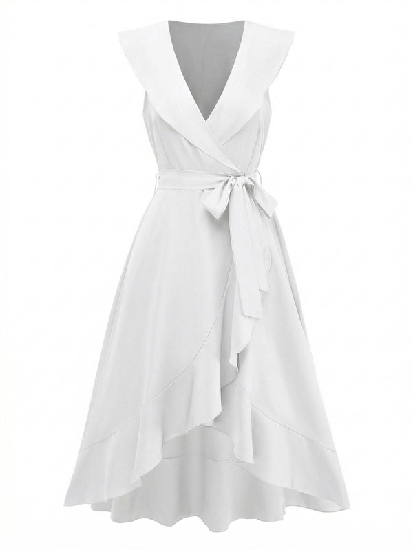1930er Uni V-Ausschnitt Rüschen Saum Bindeband Kleid
