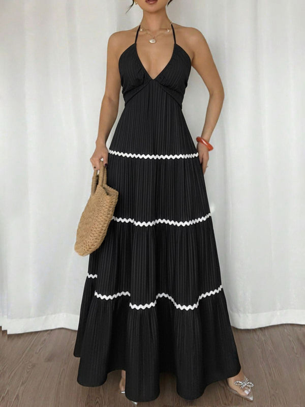 Schwarz 1930er Halter Rückenfrei Farbblock Maxi Kleid
