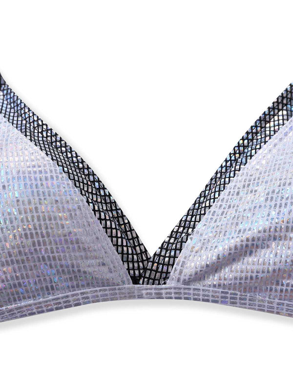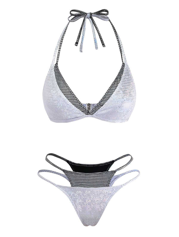 Silber 1980er Halter Schimmernd Optik Zweiteilig Bikini Set