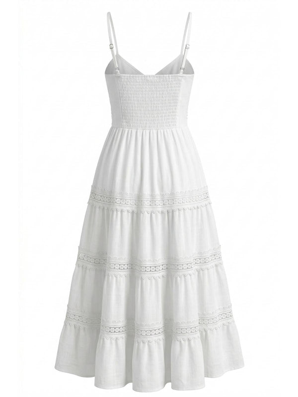Weiß 1970er Spaghetti Träger Boho Spitze Gestuft Kleid