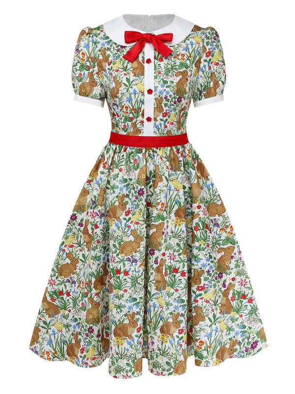 [Vorverkauf] 1950er Hase Blumen Bogen Peter Pan Kragen Kleid