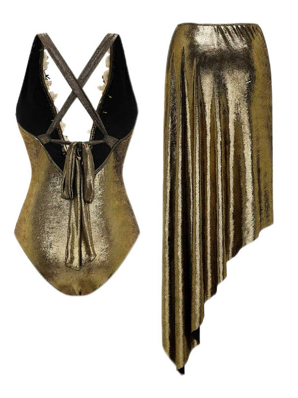 1970er Metallic Tief V-Ausschnitt 3D Blumen Badeanzug & Cover-Up
