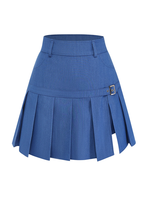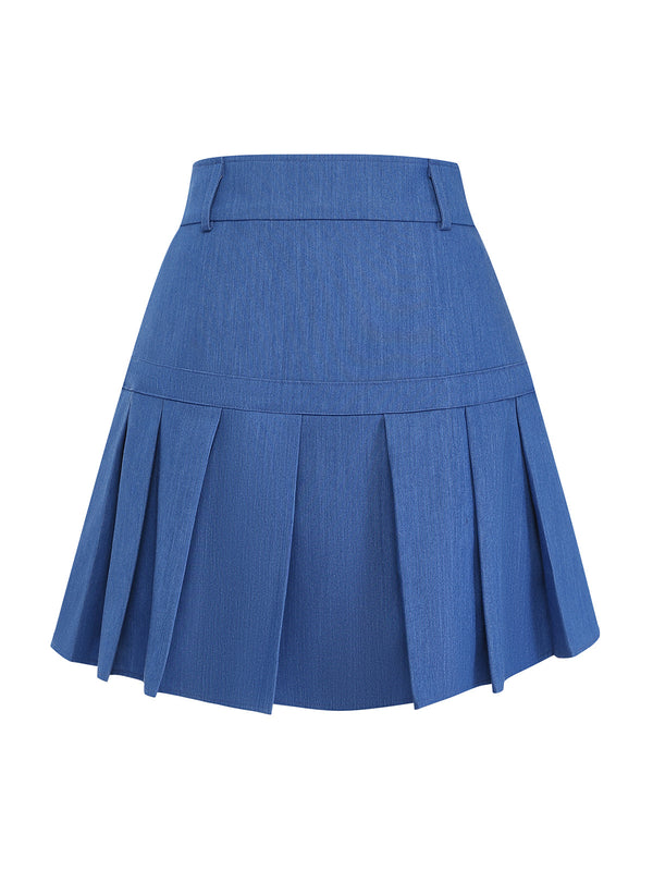 [Vorverkauf] 2PCS Blau 1960er Denim Bluse & Plissiertes Rock