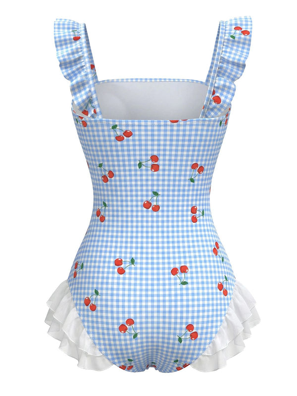 [Vorverkauf] Blau 1950er Kirsche Kariert Rüschen Einteiliger Badeanzug