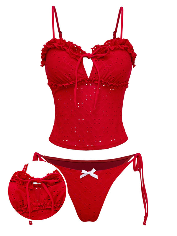 [Vorverkauf] Rot 1960er Bestickt Cutout Rüschen Tankini Set
