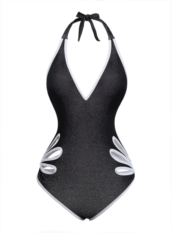 Schwarz 1940er Blumen Cut-Out Halter Einteiliger Badeanzug