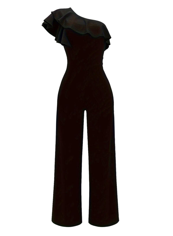Schwarz 1980er Solide Einseitig Rüschen Jumpsuit