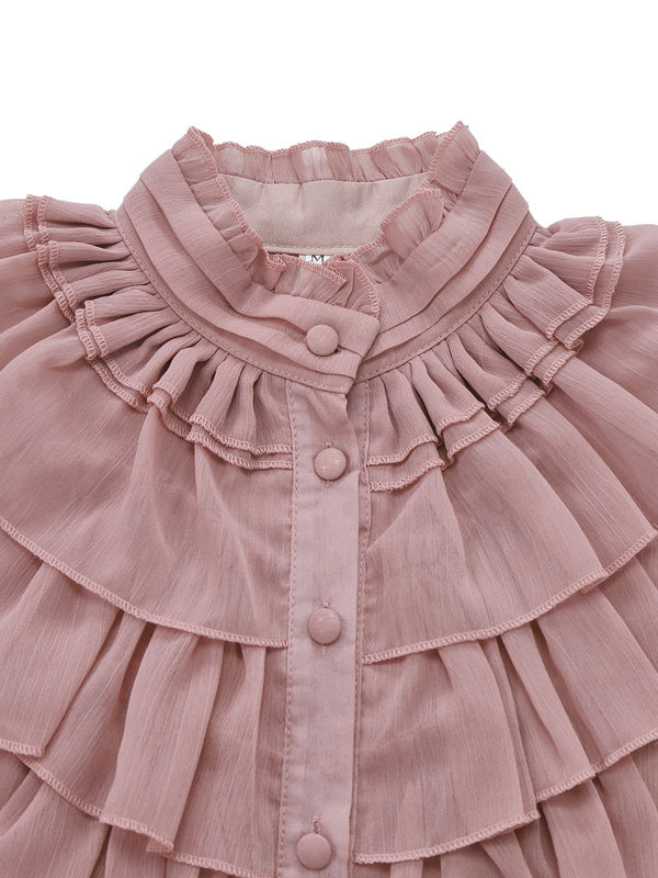Rosa 1980er Chiffon Rüschen Hochhals Bluse