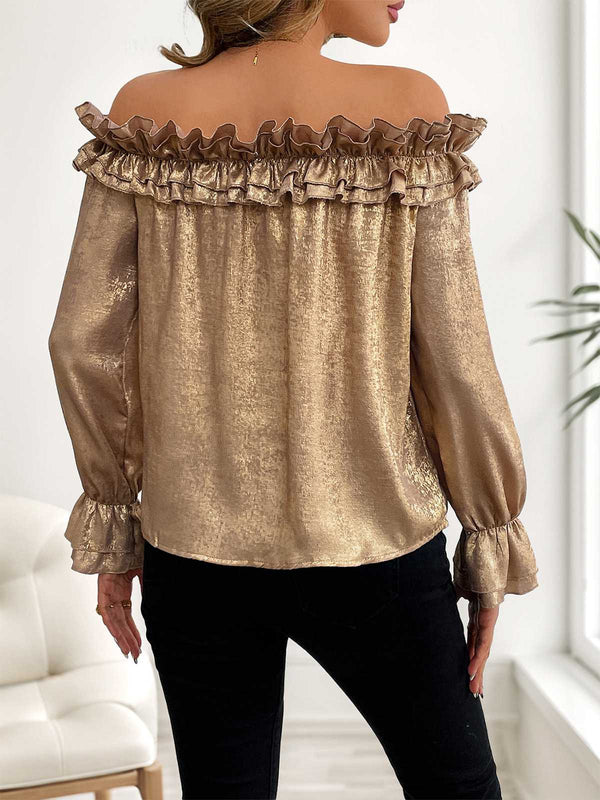 Gold 1950er Schulterfrei Rüschen Schimmer Top