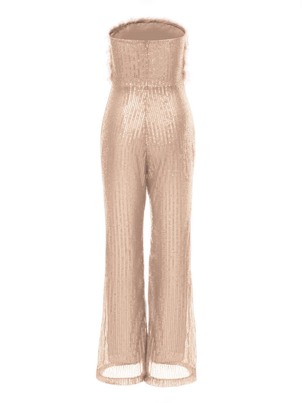 1950er Solide Feder Pailletten Patchwork Trägerlos Jumpsuit