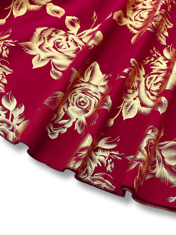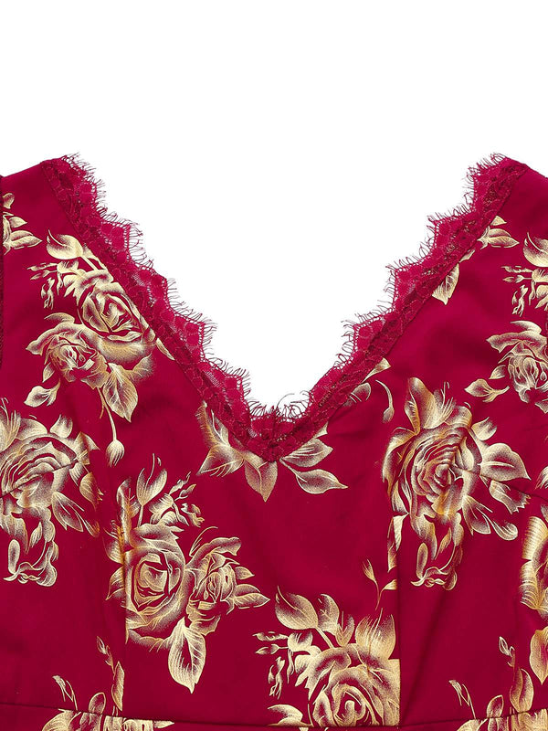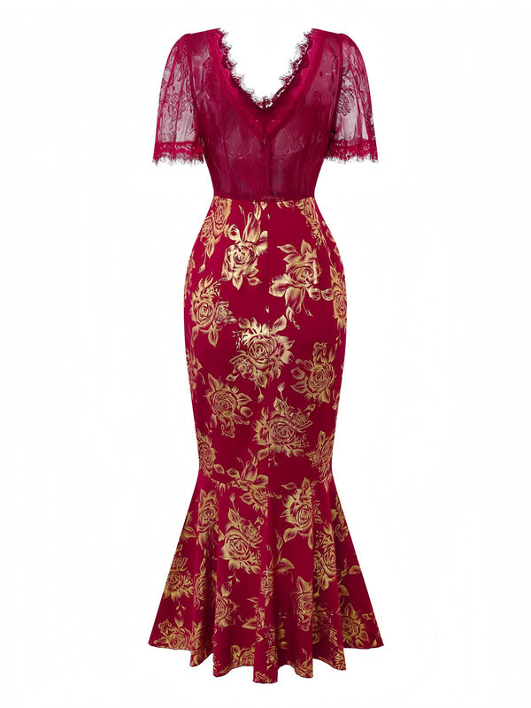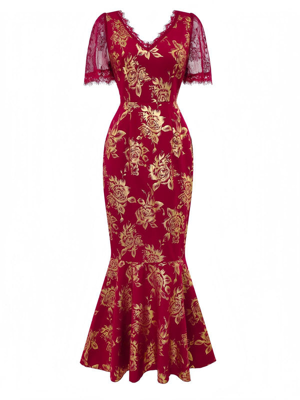 Rot 1930er Goldfolie Blumen Meerjungfrauen Durchsichtig Kleid
