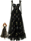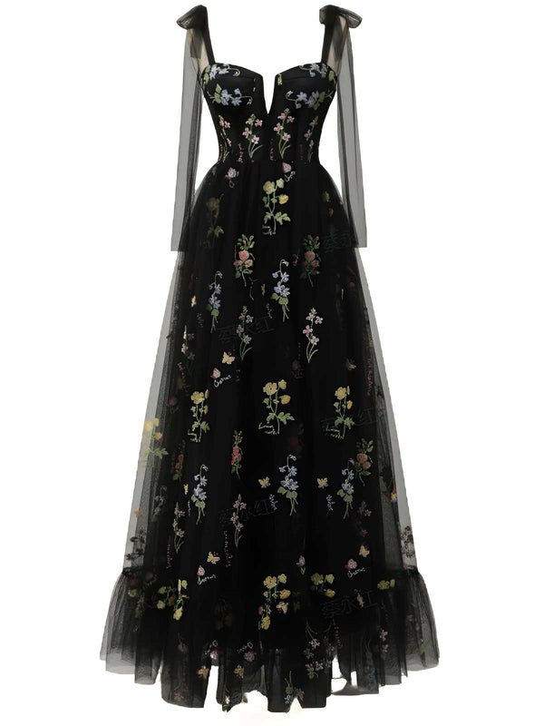 Schwarz 1930er Slip Bestickt Blumen Netz Maxi Kleid