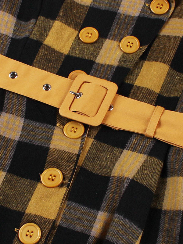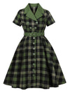 1950er Gingham Plaid Tasten Revers Gürtel Kleid