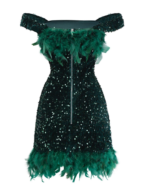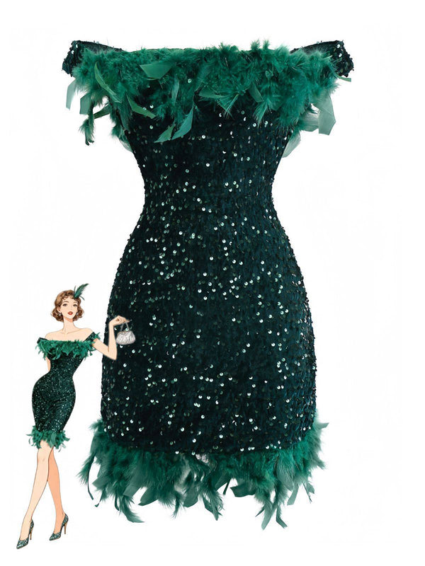 Grün 1960er Schulterfrei Pailletten Feder Enges Kleid