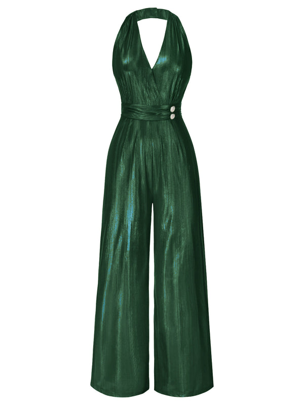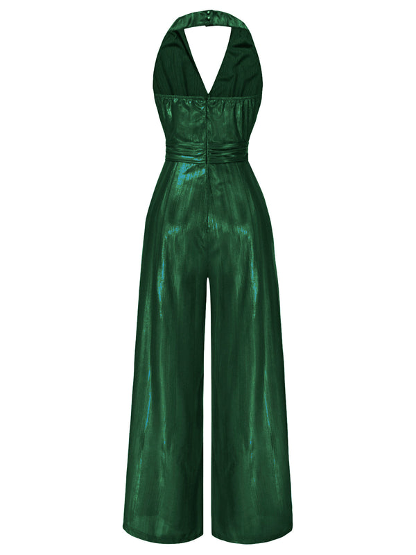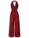 Rot 1970er Solide V-Ausschnitt Halter Jumpsuit