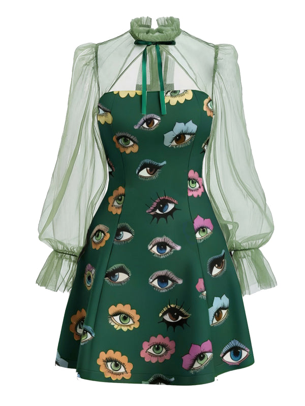 Grün 1960er Halloween Auge Drucken Netz Kleid