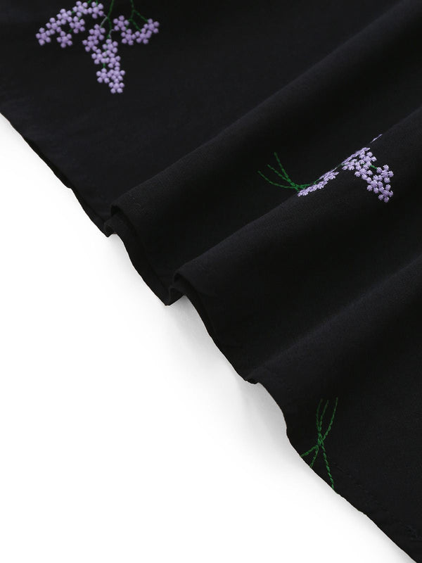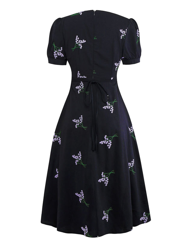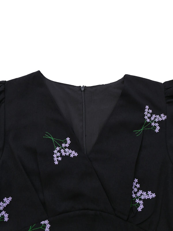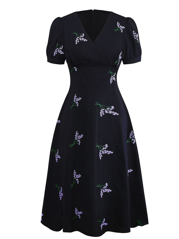 Schwarz 1940er Lila Blumen Stickerei V-Ausschnitt Kleid