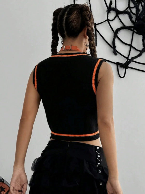 Schwarz 1970er Halloween Kürbis Gesicht Pullover Weste