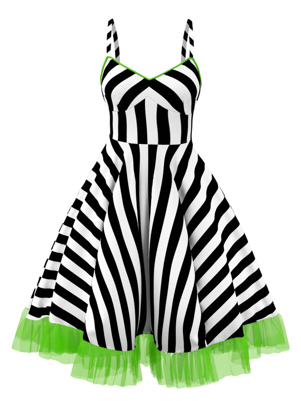 [Übergröße] Schwarz & Weiß 1950er Beetlejuice Streifen Fluoreszierend Grün Spitze Kleid
