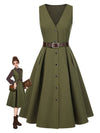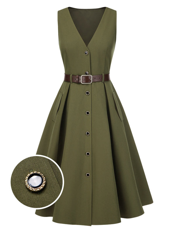 Grün 1950er V-Ausschnitt Taschen Gürtel Weste Kleid