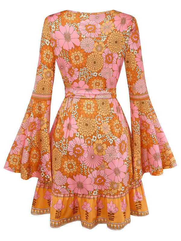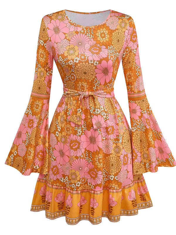 Orange 1960er Hippe Glockenärmel Blumen Kleid