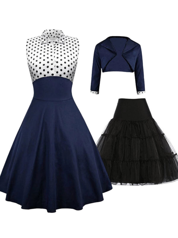 2PCS 1950er Marineblau Dot Patchwork Swing Kleid & Unterrock