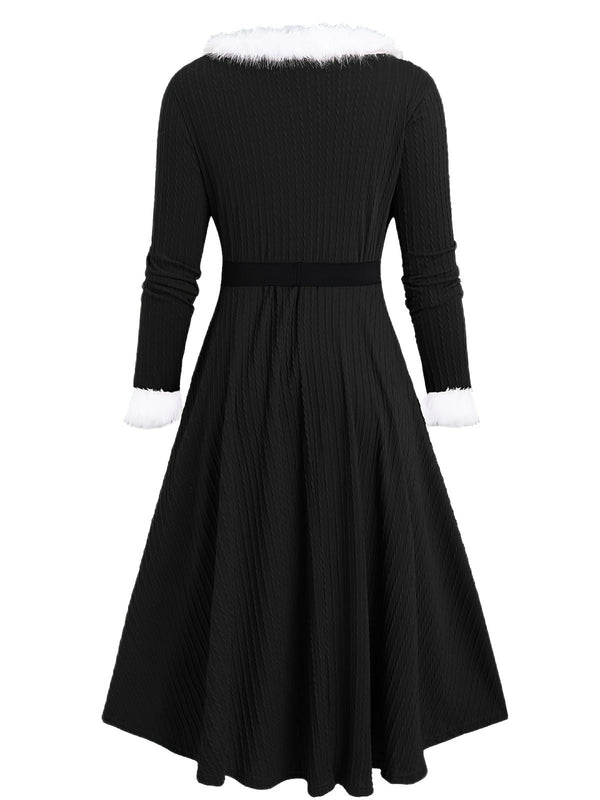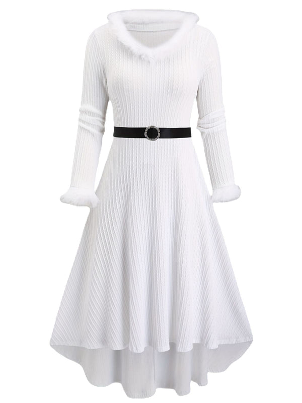 [Übergröße] Weiß 1940er Pelzkragen V-Ausschnitt Gürtel Kleid