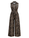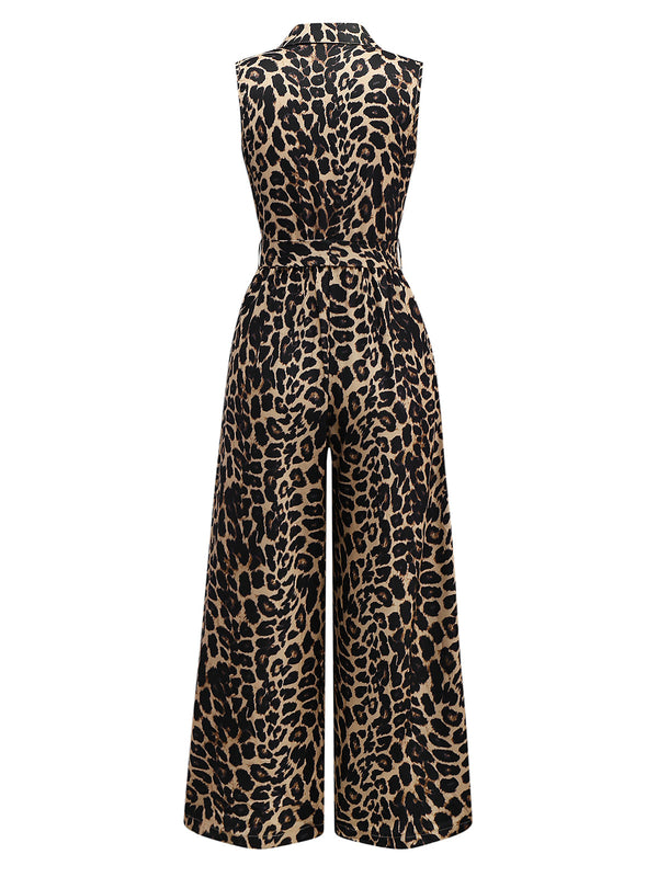 1970er Revers Leopard Ärmellos Gürtel Jumpsuit