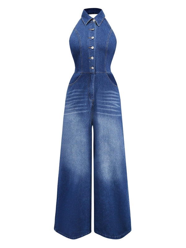 Blau 1930er Revers Ärmellos Weites Bein Denim Jumpsuit