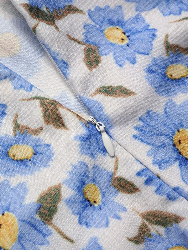 Blau 1960er Blumen Revers Gürtel Wickel Romper