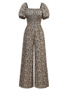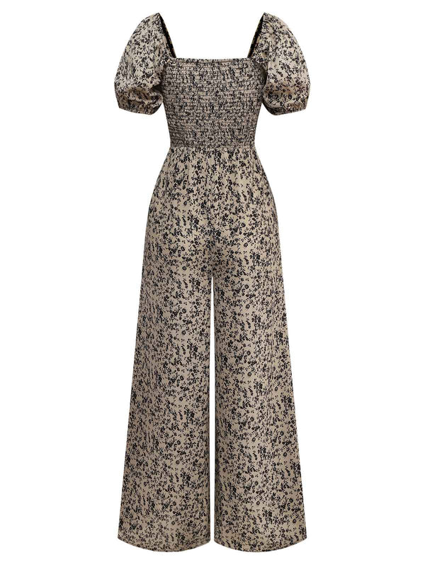 Braun 1930er Kleine Blumen Puffärmel Jumpsuit