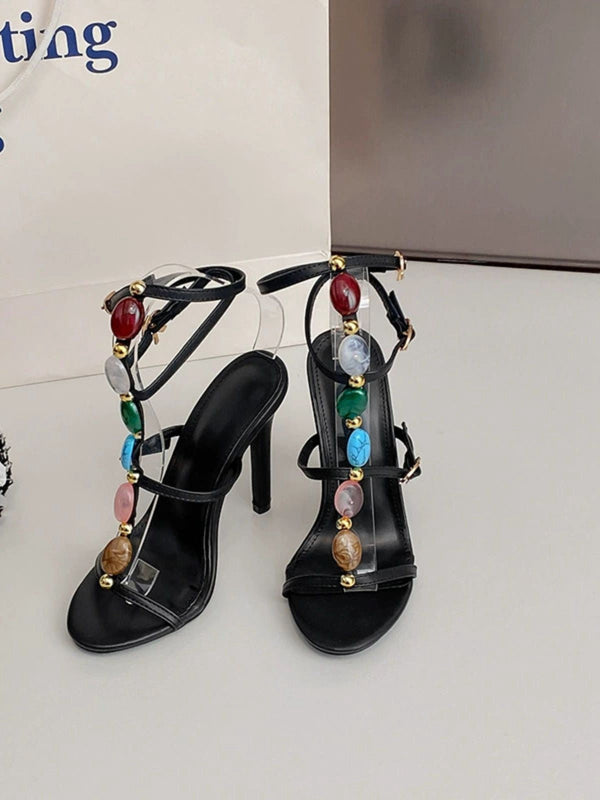 Vintage Farbig Steine Stilett Absätze Riemchen Sandalen