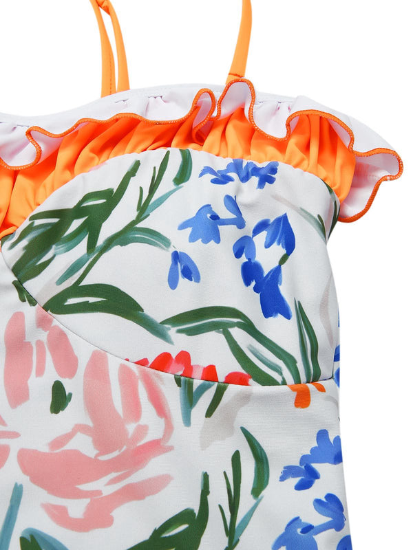 Mehrfarbig 1960er Gemalt Blumen Bandeau Badeanzug