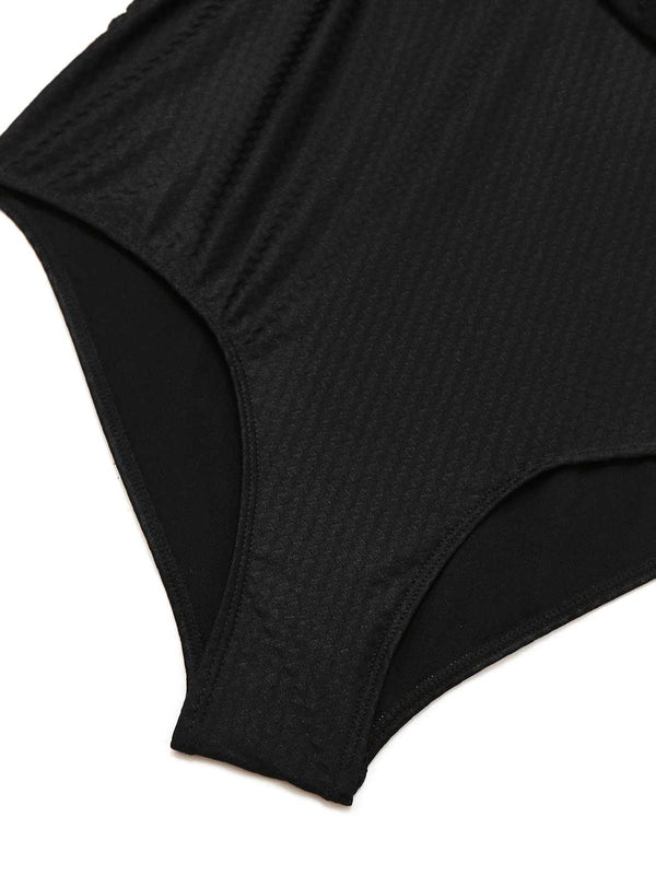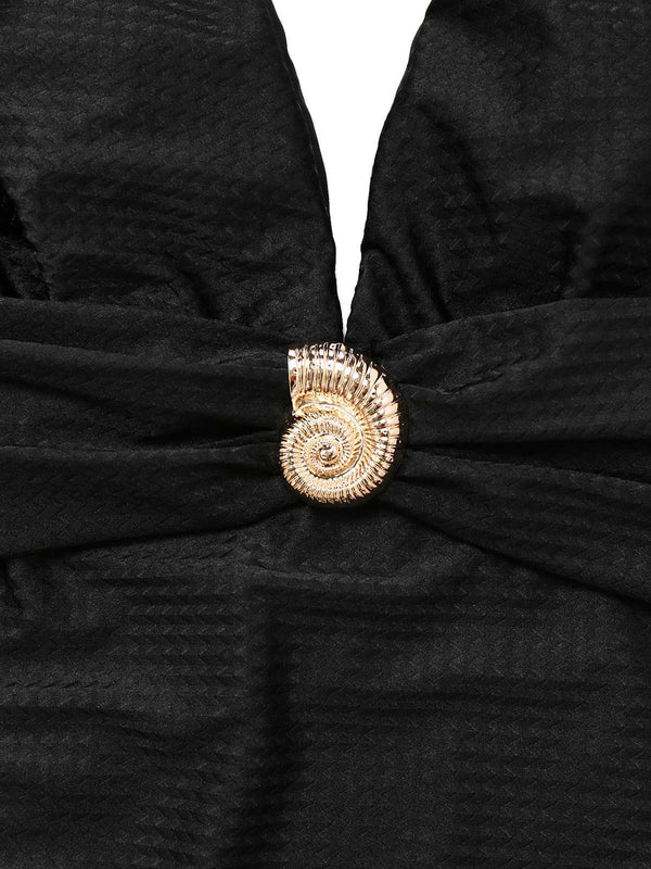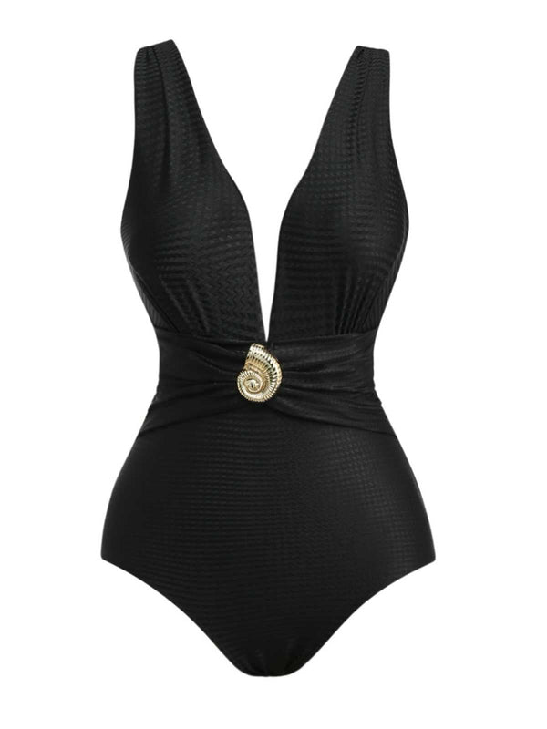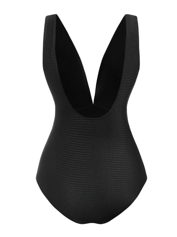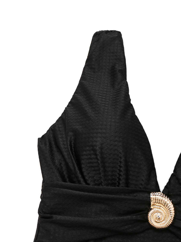 Schwarz 1930er Tief V-Ausschnitt Muschel Badeanzug