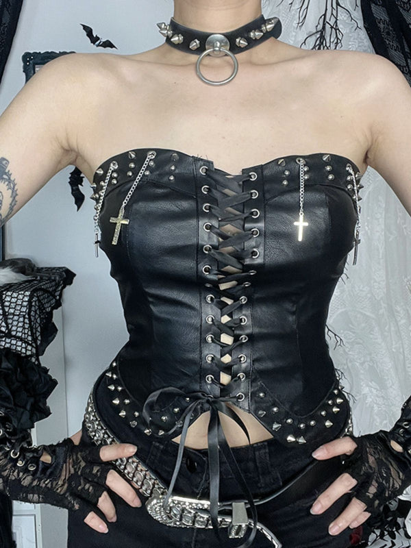 1980er Trägerlos Punk Leder Schnürung Nieten Top