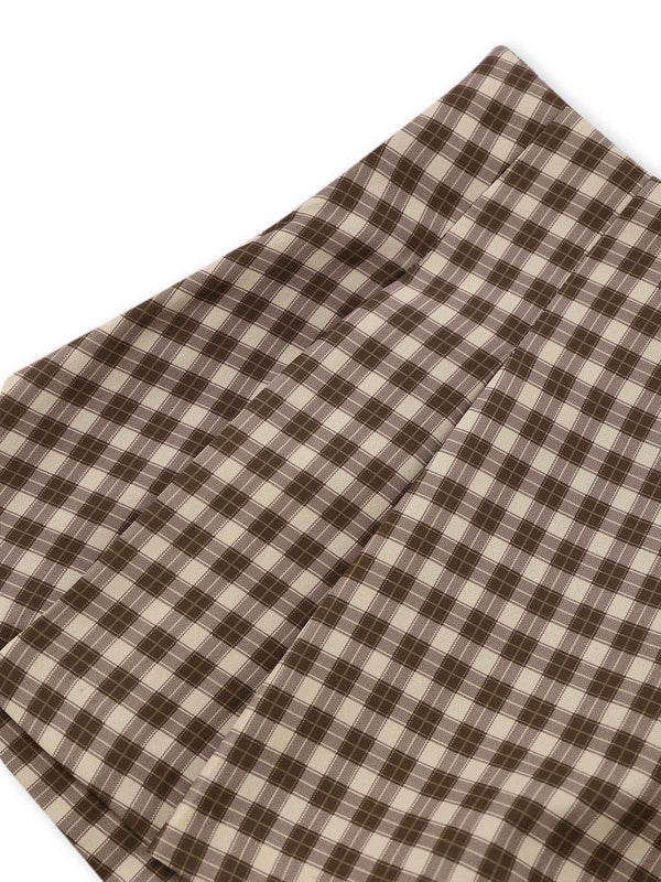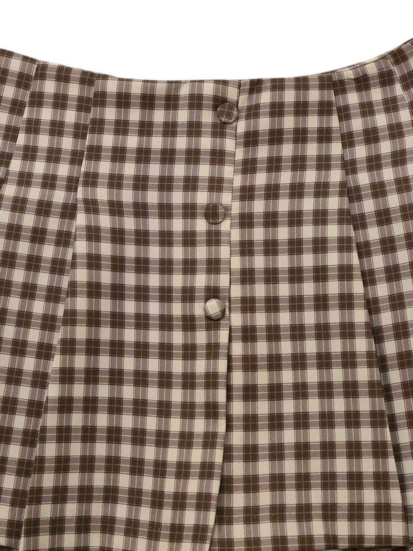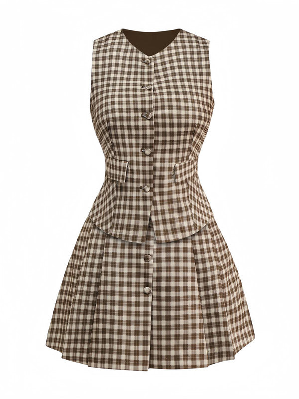 2PCS Braun 1960er Gingham Plaid Plissiertes Weste & Rock