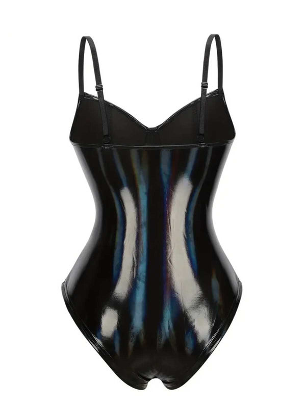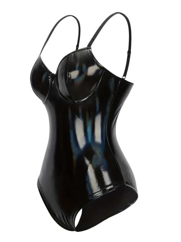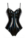 Schwarz 1980er Spaghetti Träger Leder Bodysuit