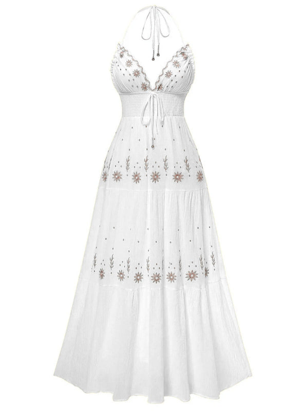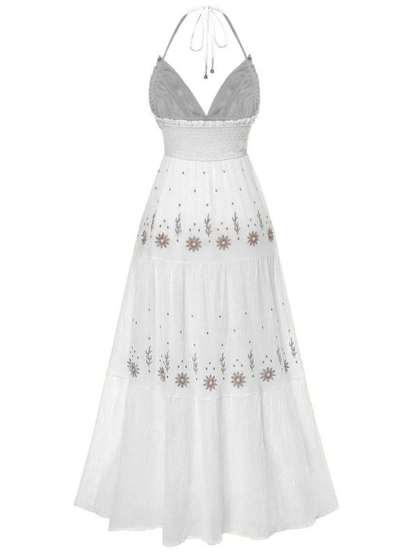 1930er Besticktes Blumen Tief V-Ausschnitt Texturiert Kleid