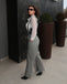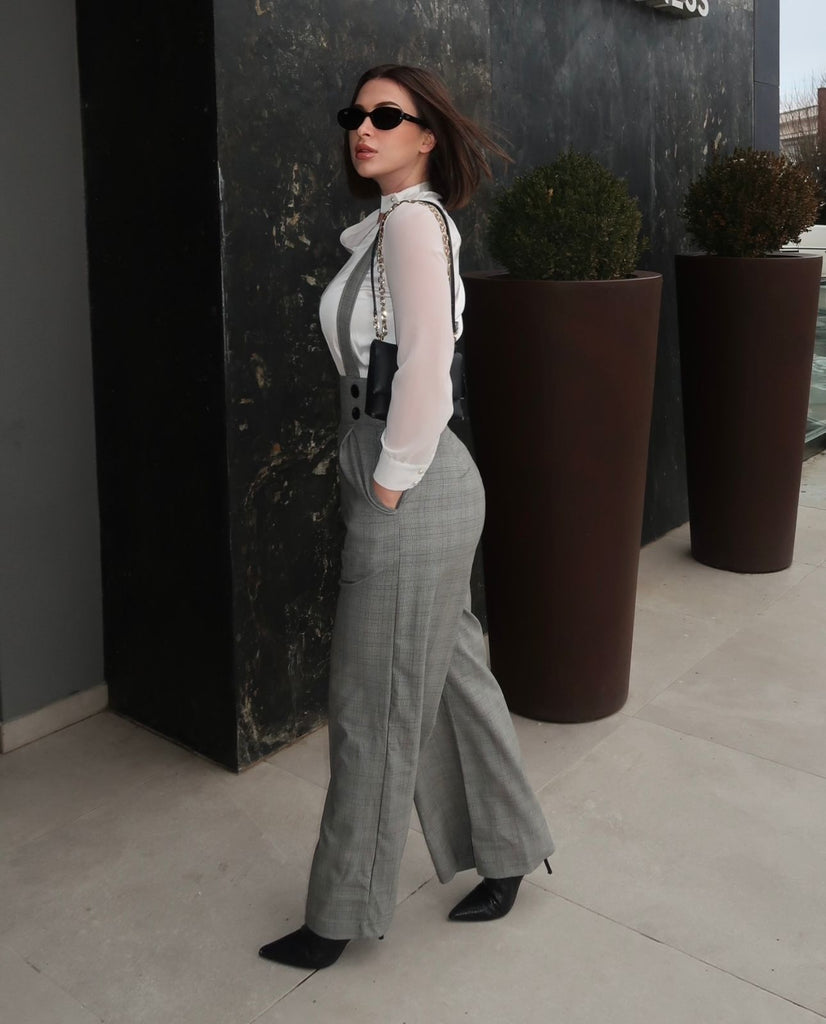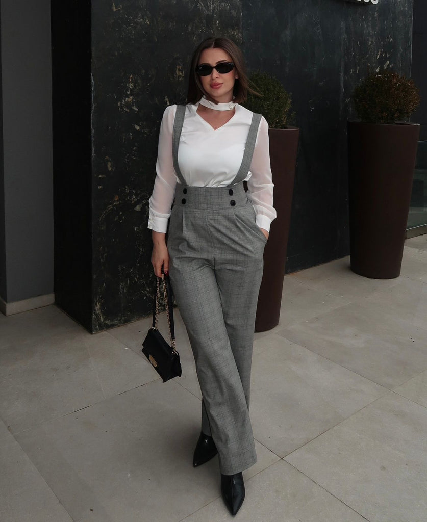 2PCS 1940er Satin Puffärmel Bluse & Glen Plaid Overall Hose