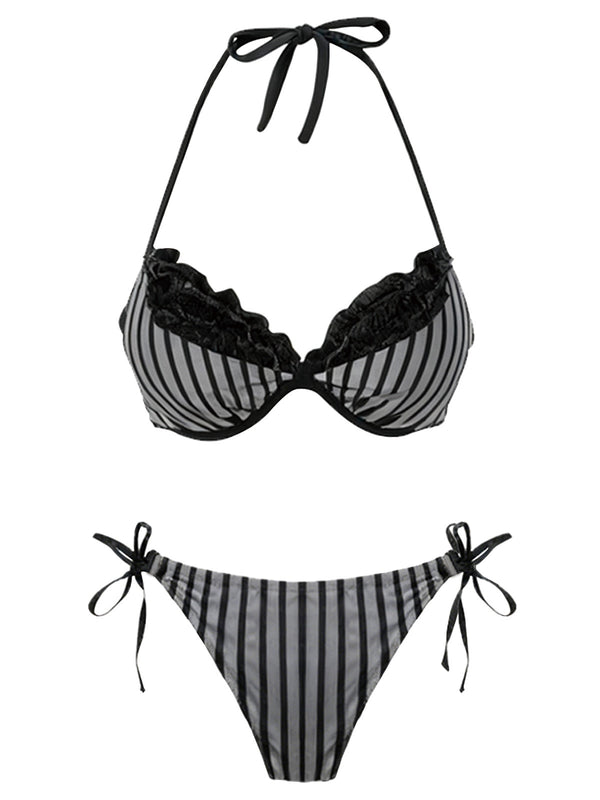2PCS Grau 1960er Streifen Bikini Set & Gestuft Cover-Up